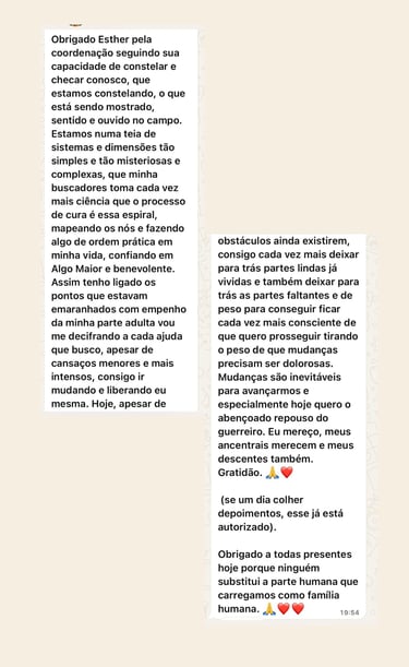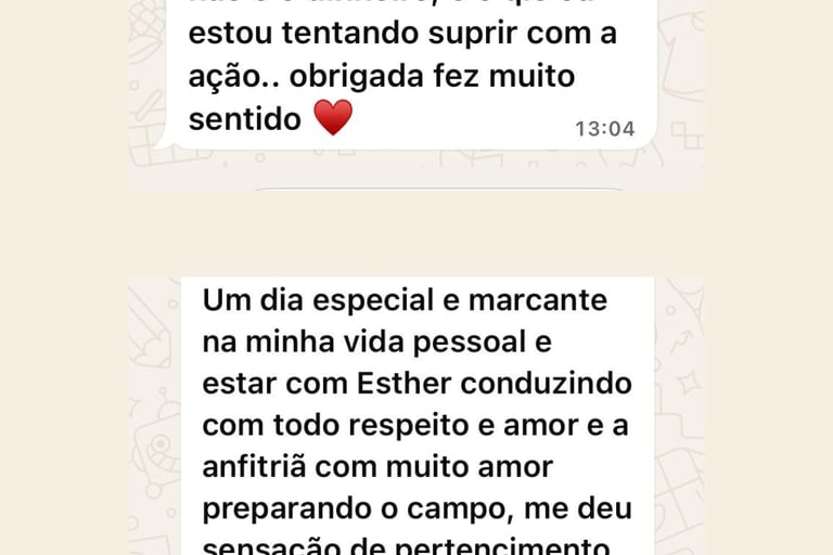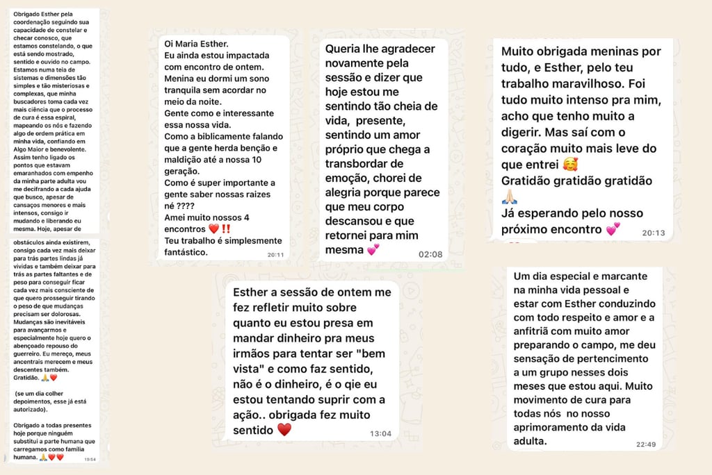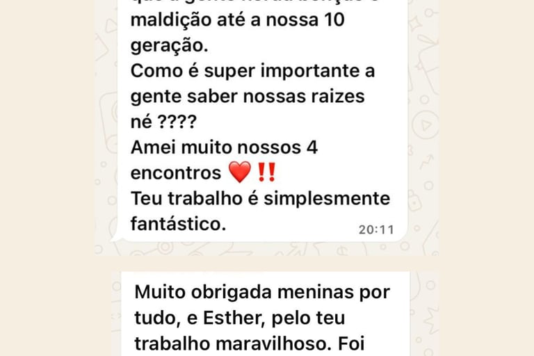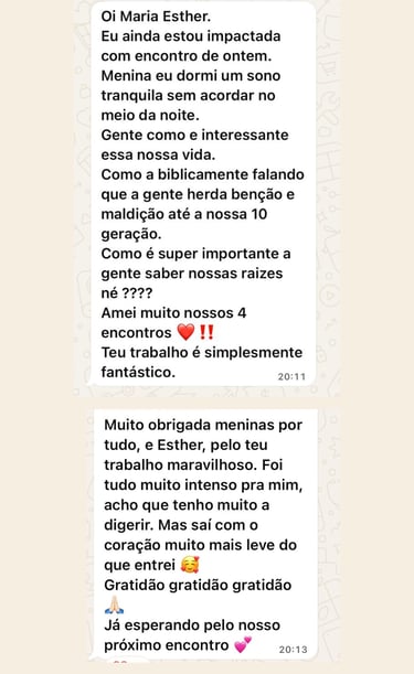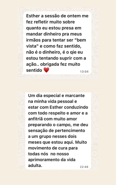 Com base na terapia sistêmica, Esther te ajuda a identificar padrões, curar vínculos antigos e se posicionar com mais consciência.
